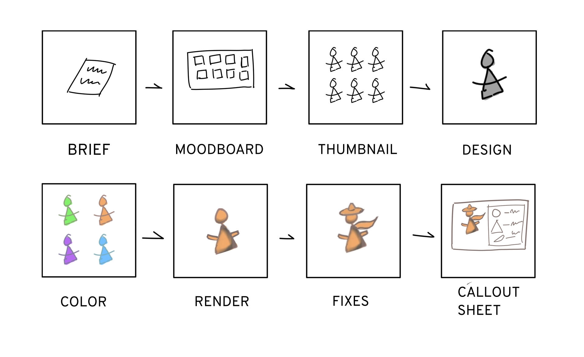 We make a sheet with notes and designs for the elements of the original design, to help 3D modelers create assets and assemble the scene.